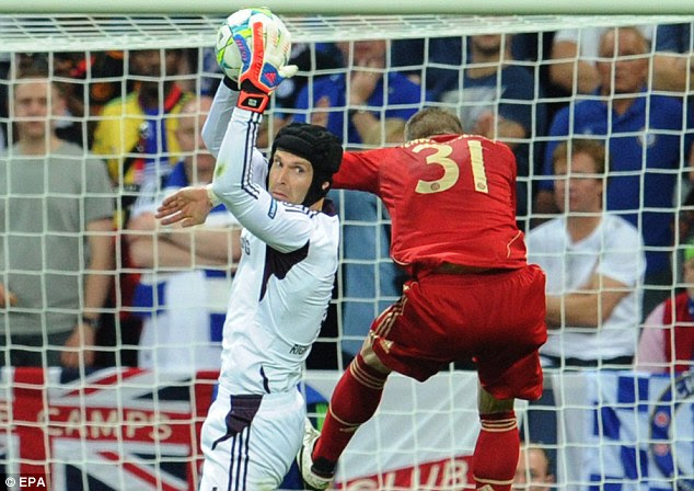 Usaha Mario Gomez pada menit ke-13 tak terlalu membahayakan gawang Chelsea. Sundulan Gomez meneruskan umpan silang Franck Ribery melambung di atas mistar.